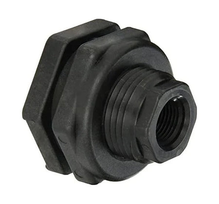 The 3/4" Banjo Bulkhead Fitting comes in black. The through-wall fittings are constructed of PP (Polypropylene) which resists corrosion, chemicals, and rust. They install through the wall of the tank by inserting the shaft through the hole of the tank from the inside so that the fitting shaft is sticking out of the tank. A gasket seals the internal fitting as a nut is threaded onto the exposed shaft to secure it to the tank.